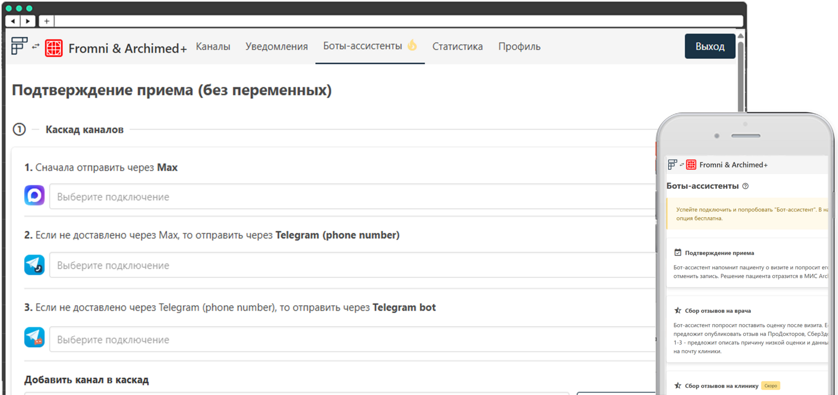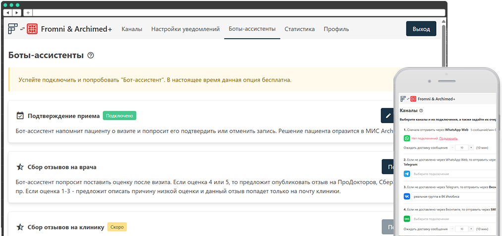 бот-ассистент автоматически подтвердит, поможет перенести или отменить визит, отправит уведомления об изменениях пациенту и сотрудникам;